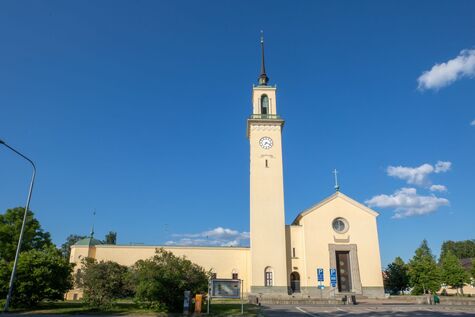 Viinikan kirkko on yksilaivainen pitkä kirkko, jonka kaunis, solakka torni, kohoaa hallitsevana omakotitaloalueen keskeltä. Kuva Juha-Pekka Aaltonen