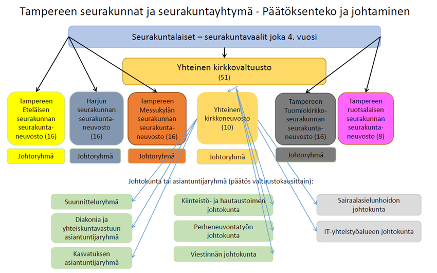 Seurakuntayhtymän päätöksenteossa on mukana seurakuntalaisista koottuja johtokuntia ja asiantuntijaryhmiä. Ne osallistuvat seurakuntayhtymän yksiköiden toimintaan suunnitellen ja kehittäen niitä yhdessä viranhaltijoiden kanssa.