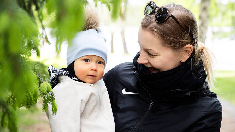 Vauvojen metsäkylpy on aikuisen ja vauvan yhteinen, ohjattu luontohetki, jossa ihmetellään metsän värejä, näkymiä ja tuoksuja.