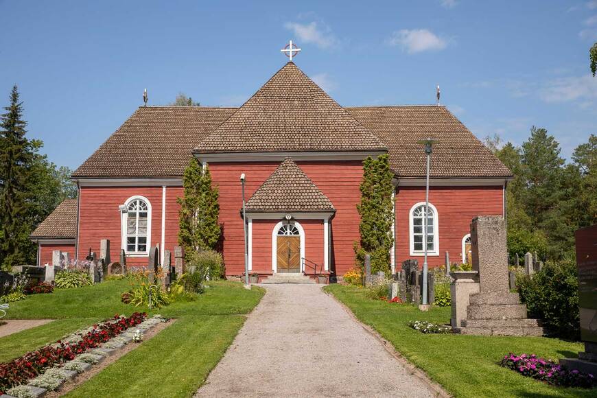 Vanha punainen puukirkko, jossa on harmaa paanukatto kesäisessä maisemassa