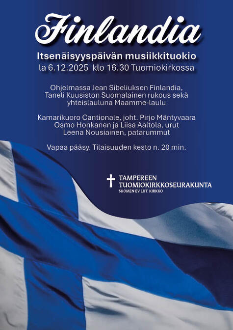 Finlandia - itsenäisyyspäivän musiikkituokio 6.12. Tuomiokirkossa klo 16.30. Finlandia esitetään sovitettuna uruille nelikätisesti, patarummuille ja sekakuorolle.