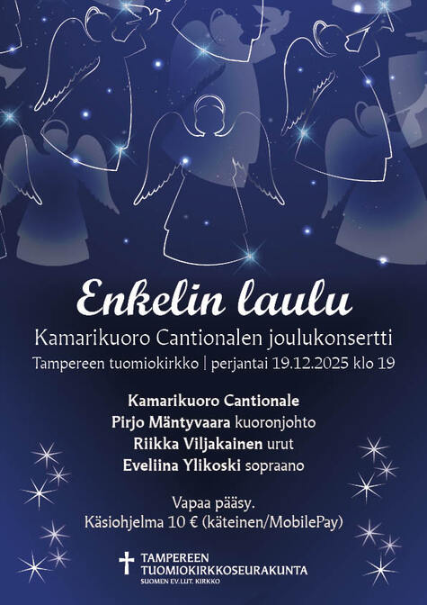 Enkelin laulu -joulukonsertti pe 19.12. klo 19 Tuomiokirkossa. Ohjelmassa Yrjö Hjeltin viisi joululaulusovitusta kuorolle, sopraanosolistille ja uruille sekä enkeli-teemaista a cappella -ohjelmistoa. Yhteisvirsinä Juhlimaan tulkaa (V 27), Enkeli taivaan (V 21) vuorovirsitoteutuksena ja Maa on niin kaunis (V 30) Anders Öhrwallin sovituksena. Vapaa pääsy, käsiohjelma 10 € (käteinen/mobilepay).