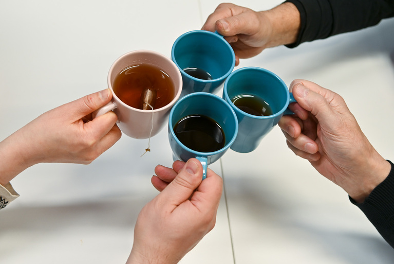 Vapaaehtoiset ohjaajat ottavat sinut vastaan kahvi- ja teetarjoilun kera.