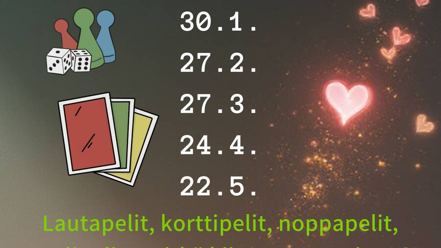 Lauta-, kortti- ja noppapelejä sinkkujen vertaisporukalla. Voit myös tuoda mukana pelejä, joita haluaisit pelata. Tarjolla teetä, mehua ja kahvia, ota muut eväät itse mukaasi.